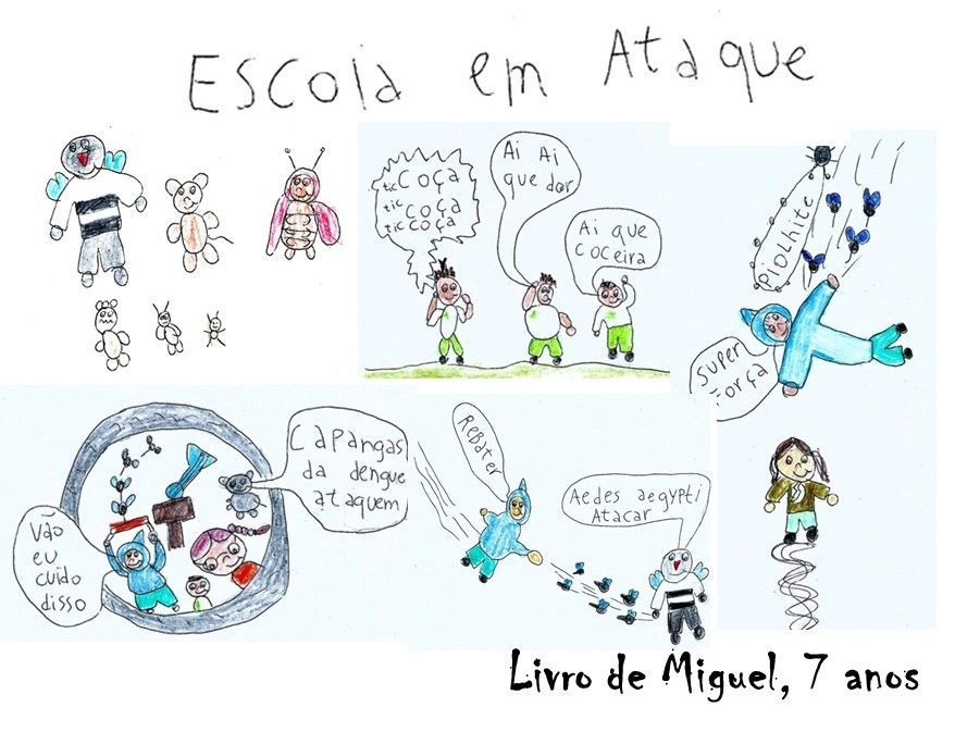 Miguel, agora com 7 anos, presenteou seus professores com seu segundo livro Escola em Ataque. Uma homenagem – expressão de amor – aos professores que se juntam a ele para salvar a escola dos piolhos e do mosquito Aedes Aegypti.